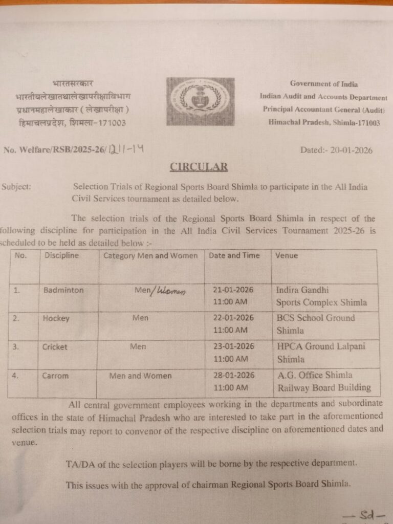 चेयरमैन रिजनल स्पोर्टस बोर्ड शिमला की विज्ञप्ति के अनुसार हिमाचल प्रदेश में विभिन्न विभागों और संबंधित कार्यालयों में नियुक्त केंद्रीय कर्मचारी जो प्रतियोगिता में भाग लेने के लिए इच्छुक हैं उनको तय दिनांक को चयनित स्थान ट्रायल देना होगा।